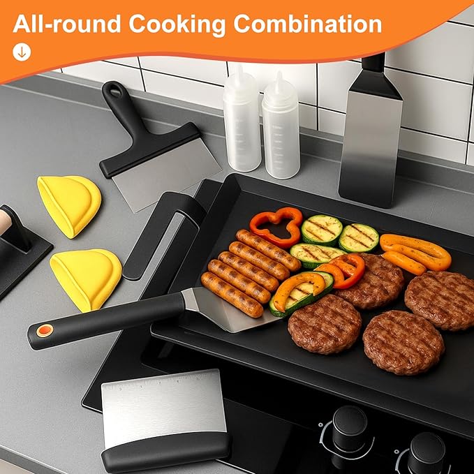 - All-round Cooking Combination: our professional griddle accessory set includes 1 carbon steel frying pan, which conducts heat evenly and stores heat well, making it suitable for frying steaks, pancakes and many other dishes; With 2 long spatulas and 1 scraper, you can stir-fry ingredients more flexibly and easily scrape off the residue on the bottom of the pan, making the cooking process smoother