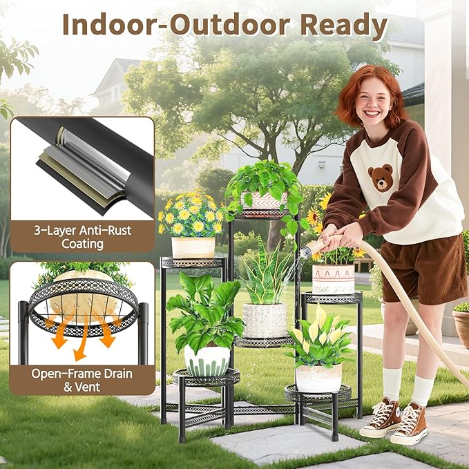 - 【Fit In, Shine Out】 No matter if your home is fancy European, cool industrial, or cozy country, our outdoor multi-layer plant stand will fit right in. It has a sleek black look that goes with anything. So it looks good in the living room, bedroom, or even on the balcony. It’s stylish but not too fussy.