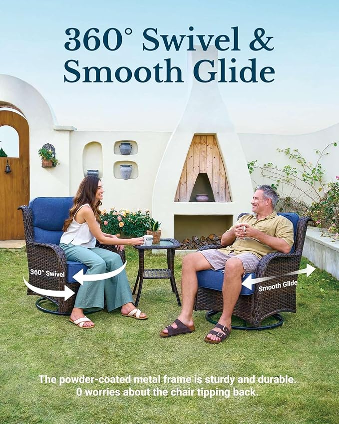 HILLGA Luxury Patio Furniture Set with 6-Inch Thick Cushions, High Back Outdoor Swivel Rocker Chairs and Table, 3-Piece All Weather Conversation Set for Porch Deck Balcony Yard, Blue (V3)