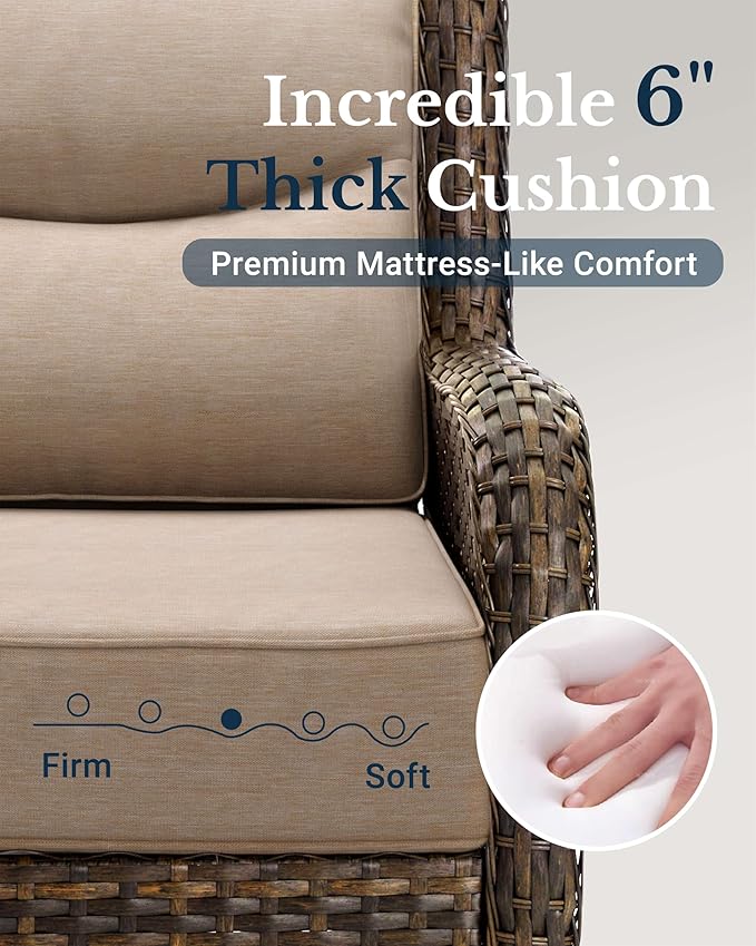- 6-Inch Extra Thick Cushion: Each cushion of our patio swivel chair and sofa is made of 6-inch thick, 28D high-density foam, so you get 40% more comfort, 30% better bounce, and 2x the durability of standard 4-inch cushions. No sagging, just support