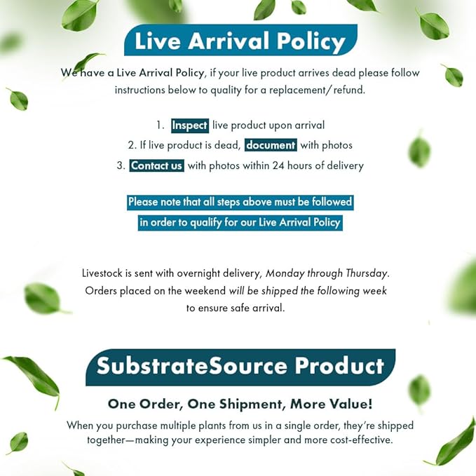 - SubstrateSource inspects each plant prior to shipping and ships all plants in healthy, stable condition with proper packing materials to ensure its safe arrival during shipping. Each plant is backed with a 100% dead-on-arrival replacement guarantee. To qualify, customers must provide a photo of the DOA plant within 24 hours of delivery.