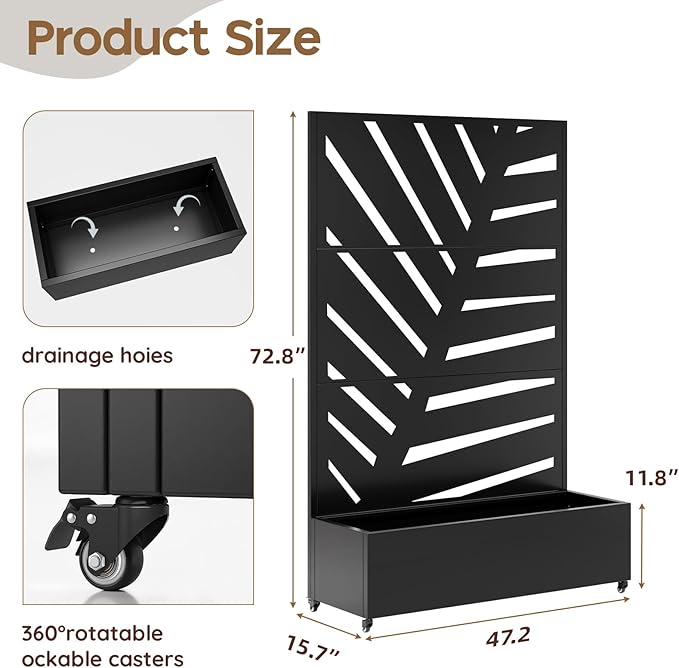 - Easy to move and superior drainage system: This vertical garden planter with trellis features 360° swivel casters, allowing you to effortlessly move the raised planter box anywhere. The privacy planters for patio also features an 11.8-inch deep planting bed with drainage holes, providing ample space for plant roots to thrive while preventing waterlogging and root rot. The planter box with trellis combine decorative appeal with practical functionality.