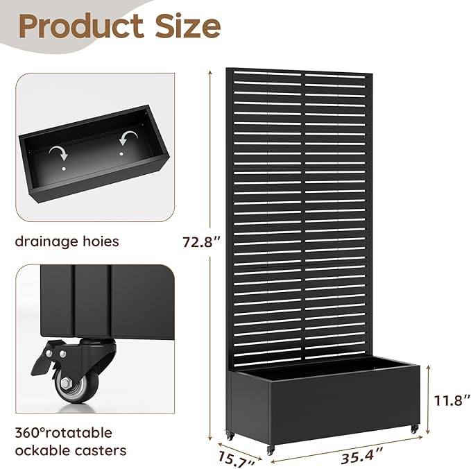 - Easy to move and superior drainage system: This vertical garden planter with trellis features 360° swivel casters, allowing you to effortlessly move the raised planter box anywhere. The privacy planters for patio also features an 11.8-inch deep planting bed with drainage holes, providing ample space for plant roots to thrive while preventing waterlogging and root rot. The planter box with trellis combine decorative appeal with practical functionality.