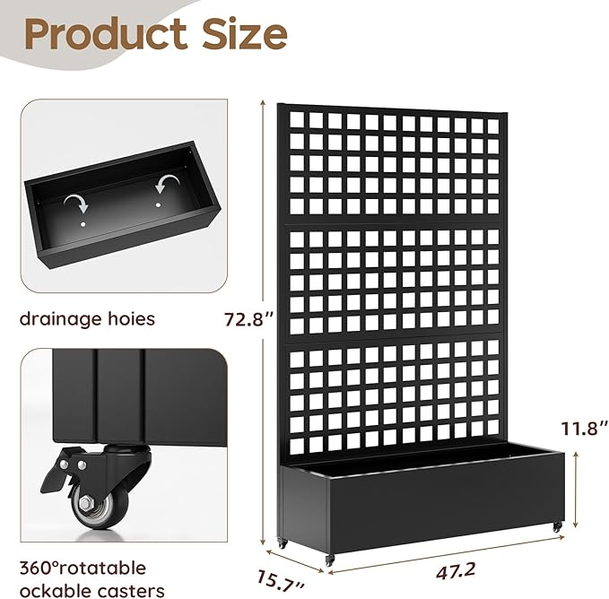 - Easy to move and superior drainage system: This vertical garden planter with trellis features 360° swivel casters, allowing you to effortlessly move the raised planter box anywhere. The privacy planters for patio also features an 11.8-inch deep planting bed with drainage holes, providing ample space for plant roots to thrive while preventing waterlogging and root rot. The planter box with trellis combine decorative appeal with practical functionality.