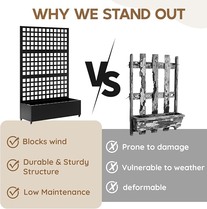 - High-Quality planter boxes outdoor with trellis: This raised planter box with trellis is crafted from premium galvanized metal and treated with a multi-layer reinforced coating. This privacy planters for patio sturdy and stable planter bed with trellis features waterproof and rust-resistant properties, withstanding all weather conditions to ensure long-lasting durability and reliable performance for extended outdoor use.