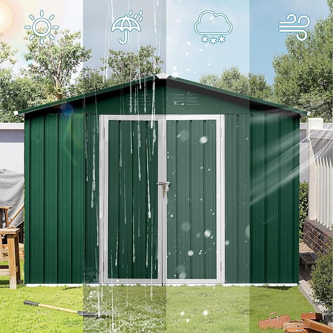 Storage Shed 8ft×6ft Classic Apex Roof Tool Shed Outdoor Storage Metal Garden Storage Sheds Tool Cabinet with Hinged Door Syste for Backyard, Patio, Poolside, Green