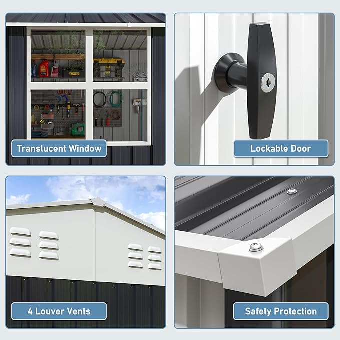 - 【Lockable Security】Our sheds have lockable doors, the lockable double door design not only facilitates easy access but also improves security, and durable corner guards, every detail has been carefully crafted with the buyer's requirements in mind to provide products that are safe, easy to use and of long-lasting quality.