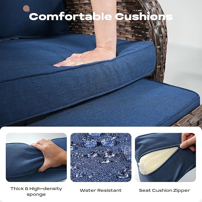 - Built to Last : This outdoor patio conversation set is constructed with hand woven with all-weather PE Rattan & powder-coated steel frame to make the outdoor seating set sturdy and durable for a long lasting outdoor use.