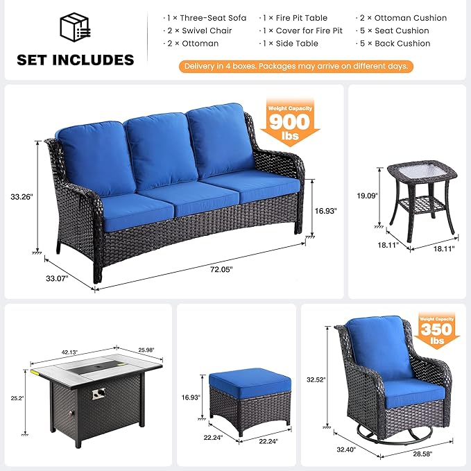 ovios 7 Pieces Patio Furniture Set, Outdoor Wicker Sofa Couch with Swivel Chairs 42" Fire Pit Table, All Weather High Back Modern Conversation Sets, Brown Rattan, Navy Blue