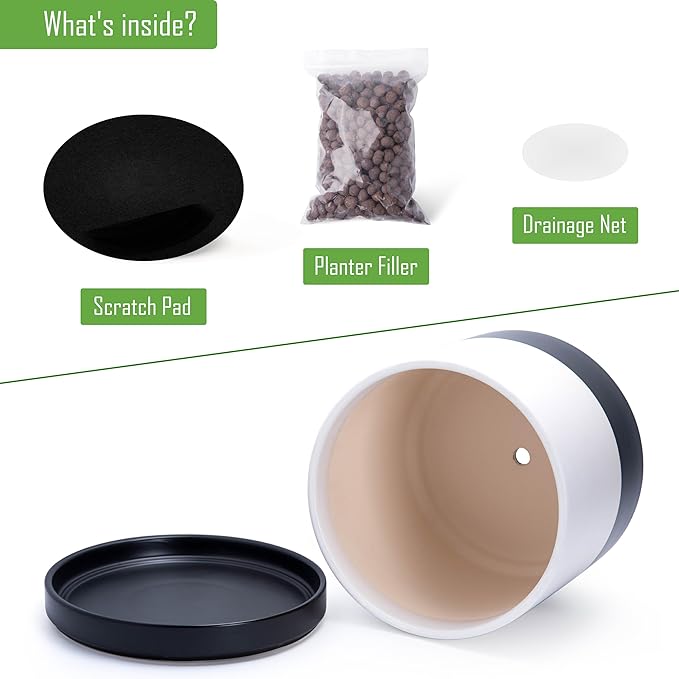 - Planter pot with drainage hole, mesh drainage net and protective scratch pad included.