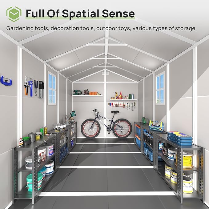 - Double-wall stable design: Tough, double-wall resin construction with impact-resistant floor for long-term durability. The overlapping wall panels are water and moisture resistant for worry-free use in all weather conditions,Weather-resistant, waterproof and UV protected will not peel, rot or rust.(Max Wind resistant grade: 6 (24-30 mph); Maximum snow thickness tolerance: 7 inches)