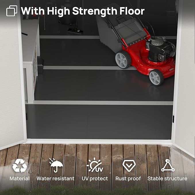 - Lockable door & with floor: Our outdoor shed has a sloped roof that adds extra storage space, prevent rainwater gathering full. Every size with the high strength floor and secure door, ensure the safety of your belongings and prevent accidental entry of small animals.