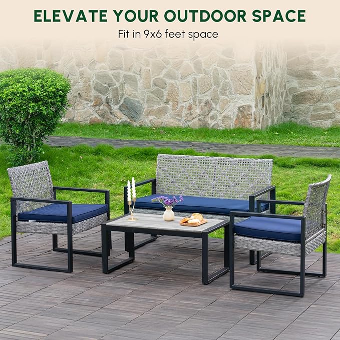 BEEFURNI Wicker Patio Furniture Outdoor Conversation Set of 4, Acacia Wood Table, 2 Rattan Chairs, 1 Loveseat, 2โ Cushions, All-Weather, Easy Assembly, 1-Year Manufacturer Warranty (Gray)