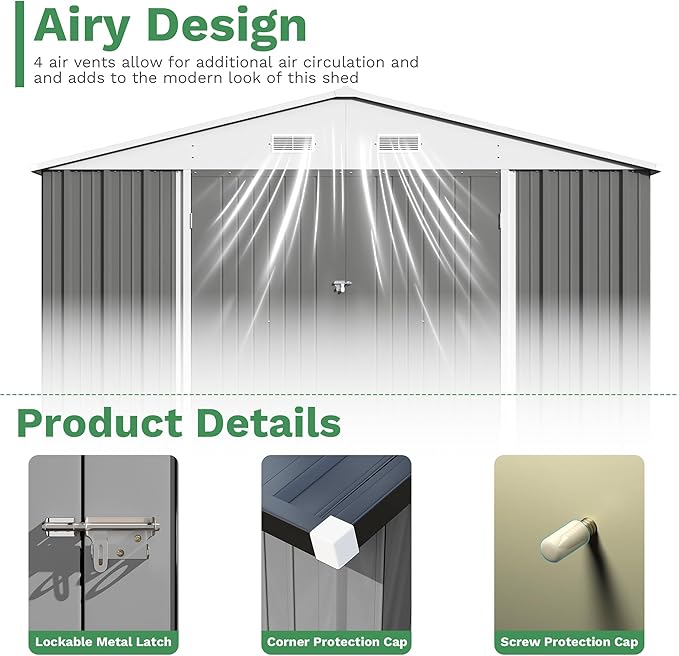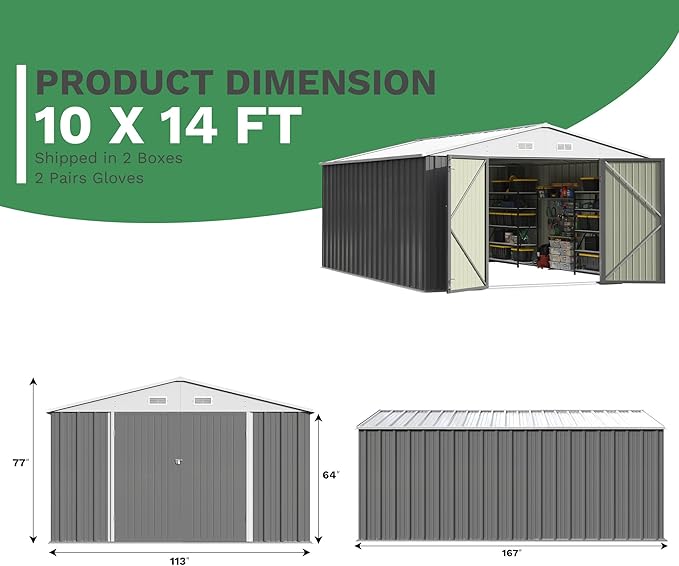 - [Large Storage Shed]: Enjoy an expansive interior space designed to accommodate your storage needs. Its 10x14 ft metal tool shed offers more interior space than other tool sheds on the market, enabling versatile usage.
