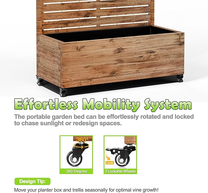 - PORTABLE GARDEN BED: Four sturdy wheels make repositioning this raised garden bed with trellis effortless, allowing you to move it with the sun. The integrated lock keeps privacy planter stable in place, perfect for flexible patio privacy layouts.