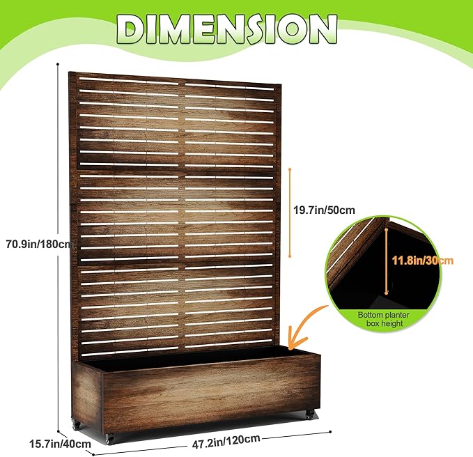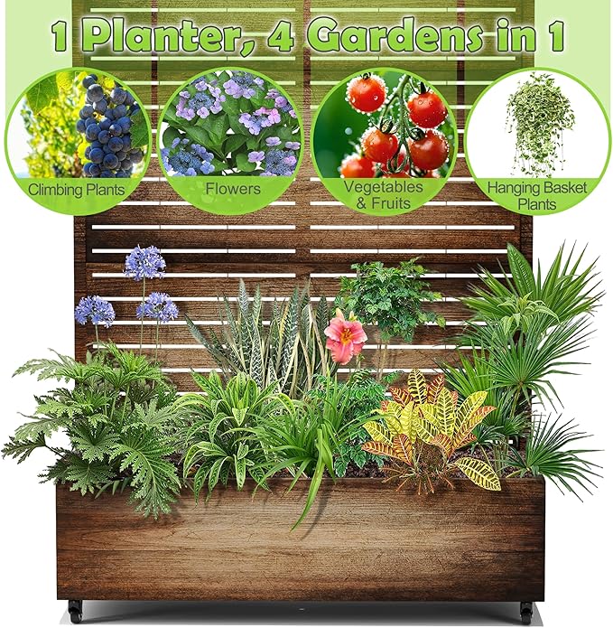 - PORTABLE GARDEN BED: Four sturdy wheels make repositioning this raised garden bed with trellis effortless, allowing you to move it with the sun. The integrated lock keeps privacy planter stable in place, perfect for flexible patio privacy layouts.