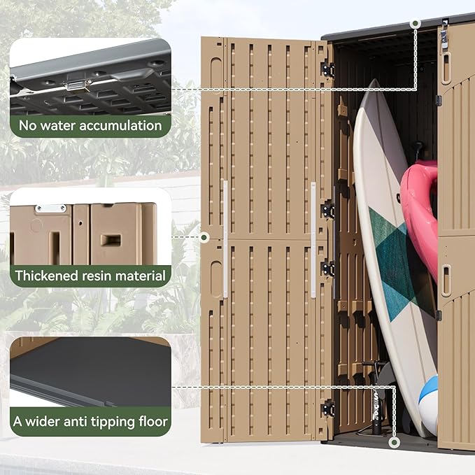 - 【Thickened Resin Material】This garden shed is crafted from specially processed double-layer resin boards, offering stronger wind resistance and greater resistance to bending compared to standard plastic sheds. It is non-toxic, odorless, weather-resistant, fade-proof, UV-protected, easy to clean and maintain, with a service life far exceeding 10 years