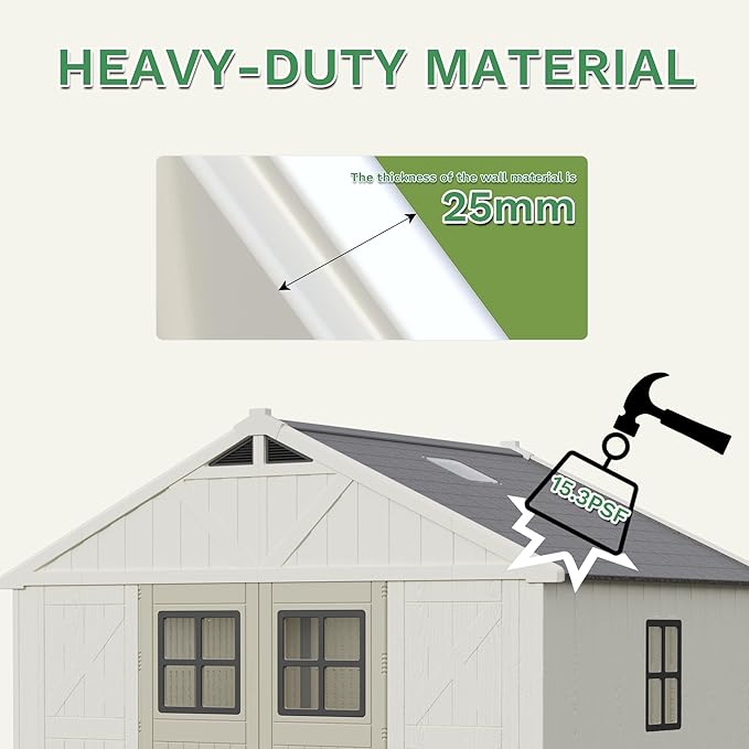 - Heavy-Duty Blow-Molded HDPE Construction – Built with durable blow-molded HDPE plastic, this shed offers exceptional strength and has a roof load capacity of 75kg/m², perfect for heavy storage needs.