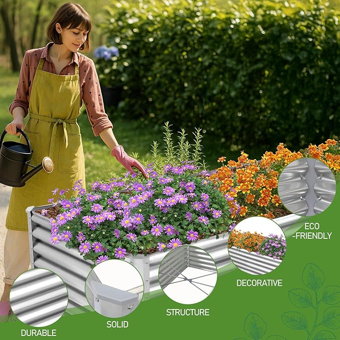 - Durable Powder-Coated Steel Construction: Crafted from heavy-duty galvanized steel with a smooth powder-coated finish, the galvanized raised garden bed resists rust, scratches, and weather wear. The sleek surface stays pristine through seasons, blending effortlessly into modern gardens or rustic landscapes.