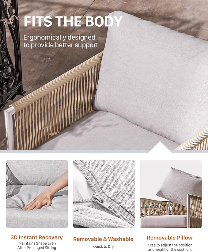 - ⛱️【6" Removable & Machine-washable Seat Cushion】 This outdoor furniture's cushion covers are removable and machine-washable, making cleaning effortless and keeping your set looking like new. Seat cushion of the set comes with high-density sponge, better for upper-body support, cushions are designed to be stable, keeping them from sliding around.