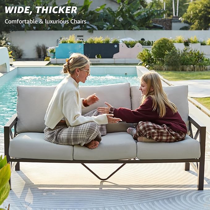- Generous Oversized, Easy Assembly: 5-piece patio conversation set includes a 3-seater bench sofa, loveseat, 2 fixed chairs with padded cushions, a metal table, perfect for seating 7 people. This patio set comes with all Hardware & necessary Tools. Follow the Instruction, you can easily and quickly assemble the set.