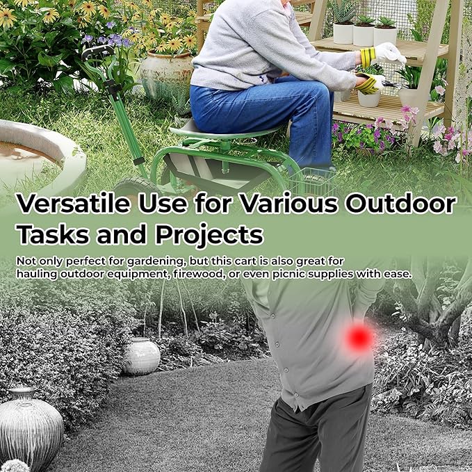 - 1.Superior Comfort and Flexibility: Experience exceptional comfort with our rolling garden work seat, featuring a 360-degree swivel seat that allows you to effortlessly change directions. The widened and cushioned seat design ensures maximum comfort, reducing pressure on your lower back during extended gardening sessions.