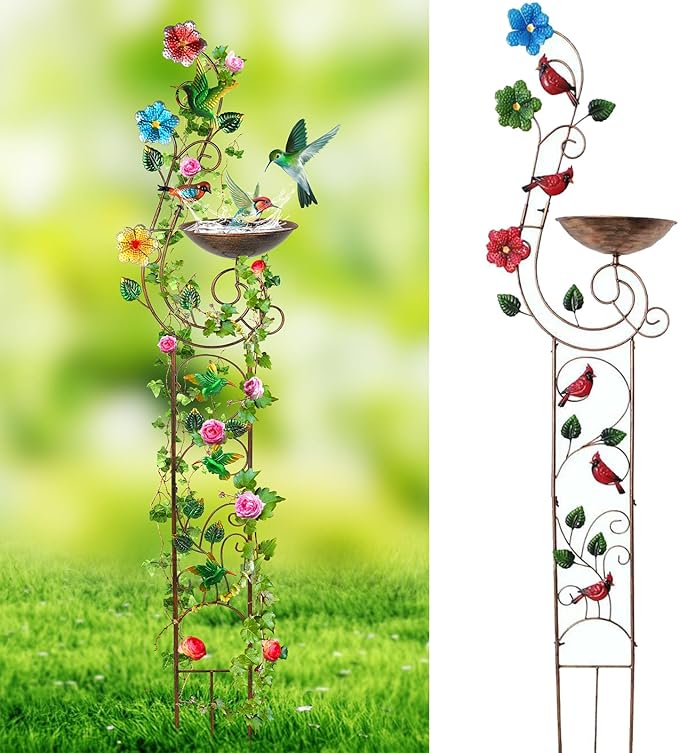 - 【Elegant Design 3 in1】The trellis comes with a detachable bird bath that attracts birds to bathe or feed here, the raised structure design creates a favorable environment for climbing flowers, and the delicate pattern and bright colors add a sculptural feel to the garden.
