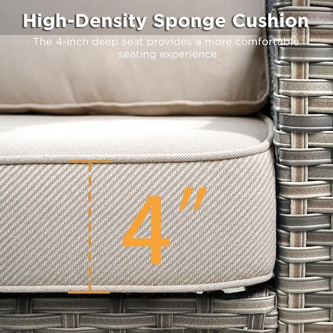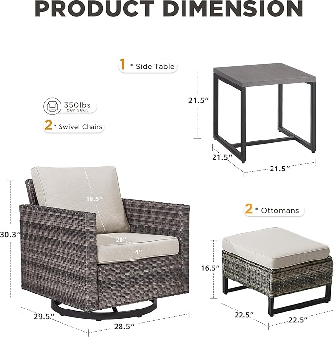 - 【High Density Cushions】Our outdoor patio furniture set come with 17" thick high-density resilient cushion and provide high resilience foam for excellent support, The cushion cover of patio swivel chair is feature UV resistant and waterproof, compared to the standard cushions found in most outdoor sets, it durable & low maintenance.