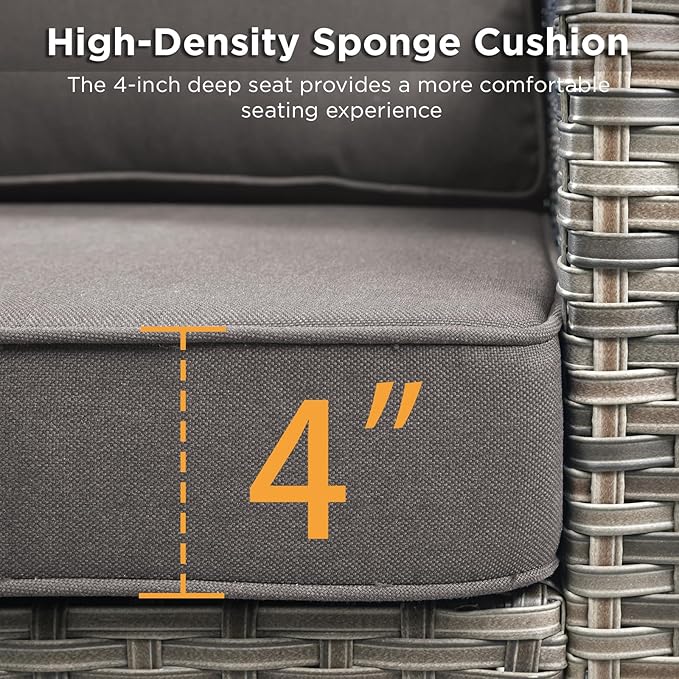 - 【High Density Cushions】Our outdoor patio furniture set come with 37" thick high-density resilient cushion and provide high resilience foam for excellent support, The cushion cover of patio swivel chair is feature UV resistant and waterproof, compared to the standard cushions found in most outdoor sets, it durable & low maintenance.