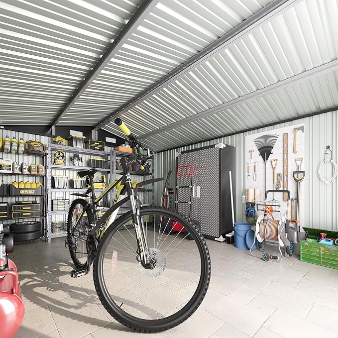 - DURABLE & WEATHERPROOF CONSTRUCTION: Built with a heavy-duty galvanized steel frame and reinforced wall panels, this shed withstands harsh elements for long-lasting use. The thick metal roof provides superior protection against rain, sun, and wind. Engineered for stability with a wind resistance rating of up to Grade 6 (24-30 mph) and a snow load capacity of up to 6 inches, ensuring your belongings are safe in various climates.