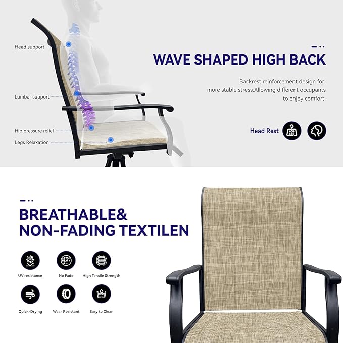 - šššæš®šÆš¹š² šš¹š¹-šŖš²š®ššµš²šæ š§š²š šš¶š¹š²š»š² šš®šÆšæš¶š°: The patio furniture set uses quick-dry, UV-resistant mesh. These outdoor chairs stay cool, clean easily, and withstand sun and rain for years