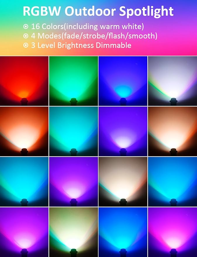 - 16 Colors and 4 Modes Spot lights Outdoor: Upgraded RGBW outdoor led landscape spotlight, 16 preset colors, 4 color changing modes (flash/strobe/fade/smooth), 3 brightness levels can be dimmed by the included remote control. Outdoor Spotlights can meet all your decorative needs for party, Halloween, Christmas, New Year's, birthdays, weddings and other holiday lighting decorations. Outdoor led landscape lights also suitable for daily white lighting