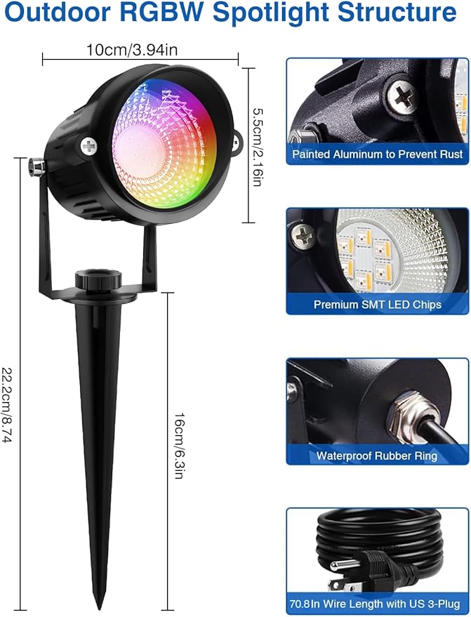 - Remote Control Color Changing Landscape Lights: RGBW Landscape Spotlights, Die-Cast Aluminum Housing, Metal Stakes. 50,000+ hours of service life. Includes a remote control, easy to change the color/mode of the spotlights. Perfect for decorating your yard, tree, house, graden, Christmas, Halloween