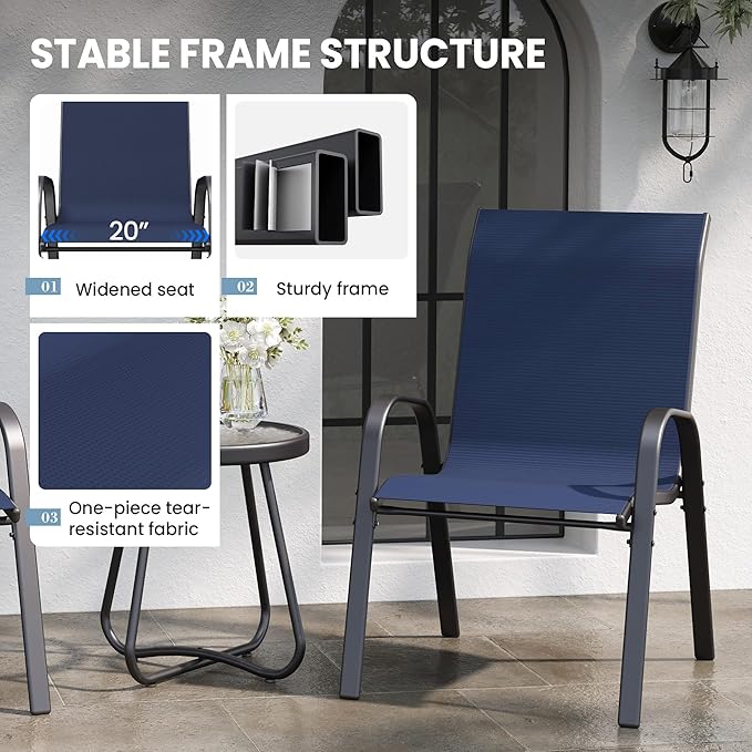 - 【Stable Steel Frame】 Built with a high-quality alloy steel frame that’s sleek, sturdy, and durable. Our outdoor dining chairs strong enough for daily use and designed to last through the seasons.