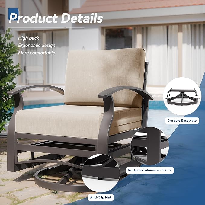- Upgrade Chair: The base of the swivel rocker chair is a dual-function base that can swivel 360 degrees and also glide back and forth smoothly. Full-rotation patio chairs allow you to face or leave the sun easily. The unique design of swinging back and forth allows you to enjoy ultimate relaxation. Equipped with several non-slip pads in the bottom, the patio swivel glider chair can stand stable and will not wobble