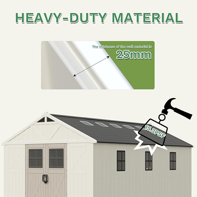 - Heavy-Duty Blow-Molded HDPE Construction – Built with durable blow-molded HDPE plastic, this shed offers exceptional strength and has a roof load capacity of 75kg/m², perfect for heavy storage needs.
