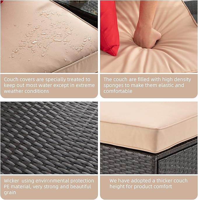 - Multiple Combination: Use your imagination to create the most beautiful 5 Pieces Patio Furniture Sets, Each part of this 6- piece patio furniture could be used separately, easily allowing to be combined into different configurations according to your needs. And there's a glass tea table where you can display your favorite things. Such as potted plants, vases and even small televisions. Offer a Bonus Seat Cushion as a Gift, the table can be an extra seating making this set a patio daybed