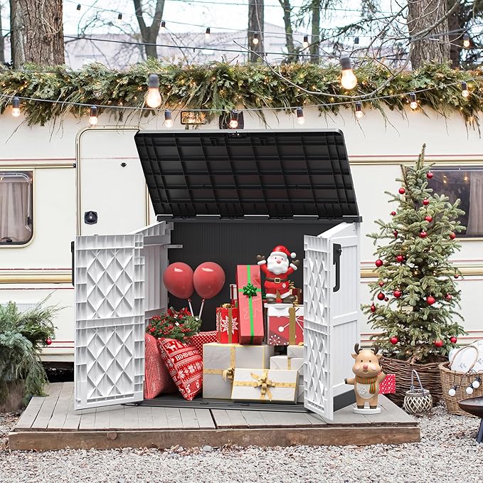 - Safety Design:Our outdoor storage shed features a double-protection design. It has pre-drilled locking holes on the top of the cabinet and a foot-operated latch at the bottom, allowing operation without crouching. Two locks ensure the safety and intactness of your outdoor items—even when used as a bike storage shed.